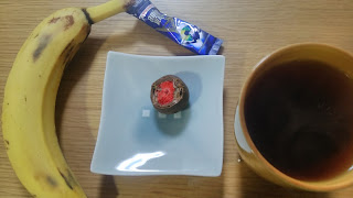間食にバナナとあまおう苺のチョコ、紅茶。