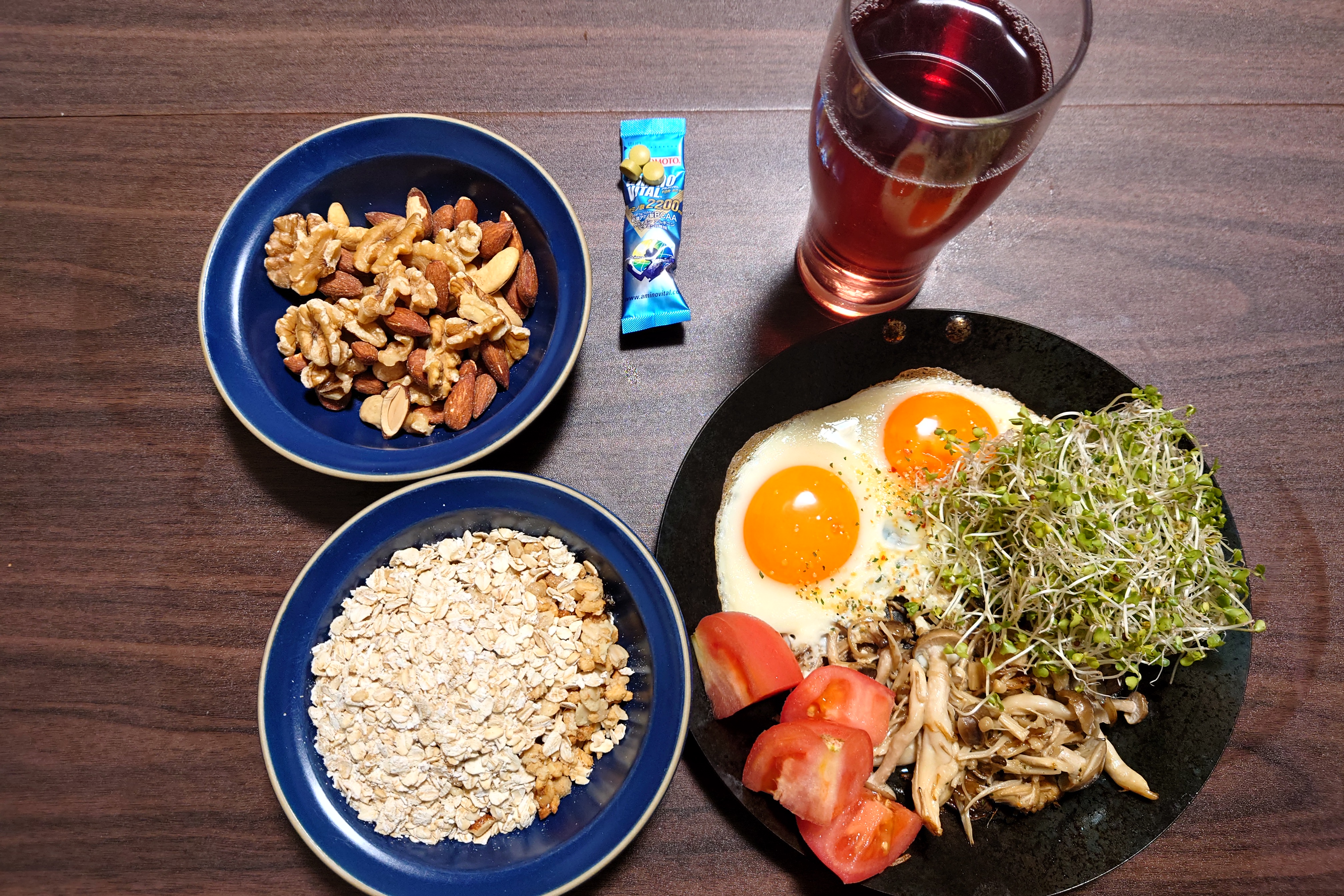 グラノーラ50g&オーツ麦30g、トマト、ブロッコリースプラウト、目玉焼2枚、キノコのソテー、無塩ミックスナッツ80g、アミノバイタル、ユーグレナタブレット、ブルーベリー&ブドウ酢